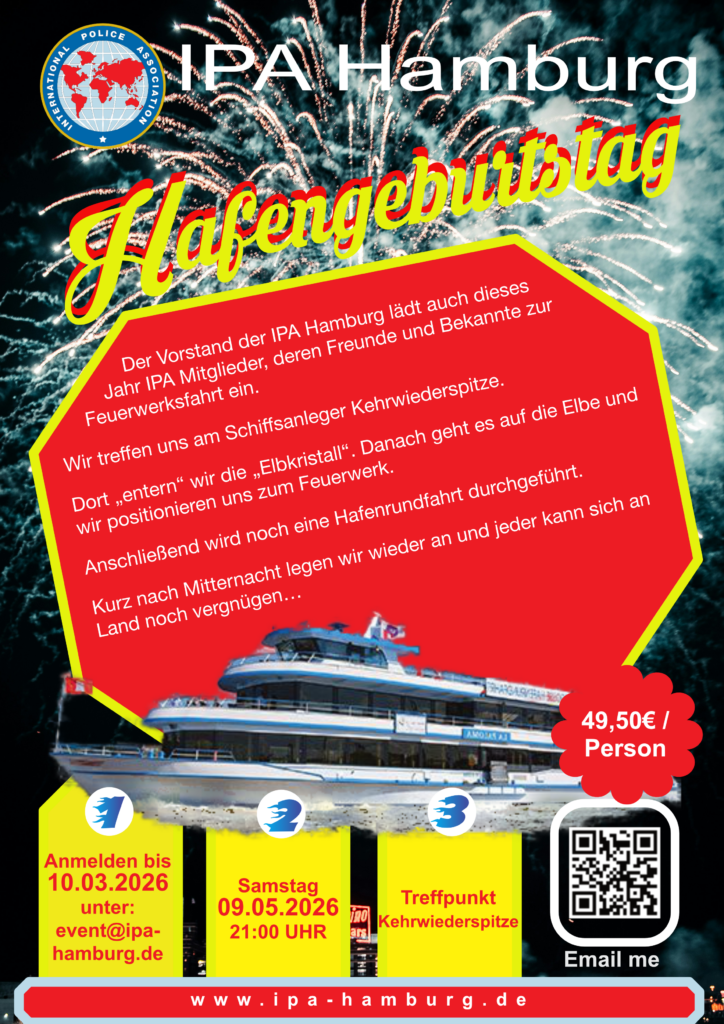 Z.Zt. stehen 50 Plätze für die Mitfahrt für IPA Mitglieder, Freunde und Bekannte zur Verfügung (Option für mehr). Die Fahrt (Feuerwerk und Rundfahrt) wird mind. 3 Stunden dauern, Rückkehr soll nach Mitternacht sein! Dieses Jahr ist kein gemeinsamen Essen geplant. Treffen ist 21 Uhr am Anleger Kehrwiederspitze.